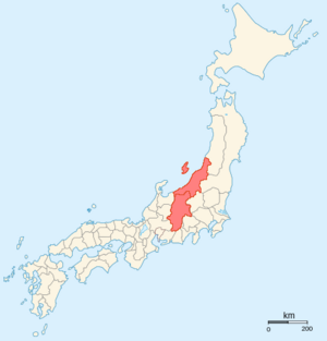The area encompasses the old provinces of Shinano and Echigo. Though the name is a combination of those two provinces, the region also contains Sado Island from Sado Province. It is located in the modern-day prefectures of Nagano and Niigata.
