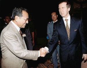 حين زارت مارگريت ثاتشر ماليزيا في التسعينيات، قالت "كنت أتمنى أن يكون لدي وزير مالية مثل أنور ابراهيم مما أوغر صدر مهاتير صاحب العلاقة المتوترة دوماً مع انجلترا المستعمر السابق. وعند اشتداد الأزمة الاقتصادية لنمور جنوب شرق آسيا وحرب العملات، اختلف مهاتير مع ابراهيم على أسلوب المعالجة فأقاله ثم أتبع ذلك بتهمة الاغتصاب الجنسي لسائقه الإندونيسي.