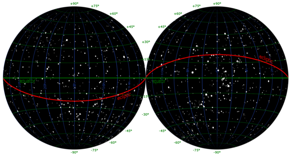 صعود مستقيم and declination as seen on the inside of the celestial sphere. الاتجاه الرئيسي للنظام هو vernal equinox, the ascending node of the ecliptic (أحمر) على خط الإستواء السماوي (أزرق). Declination is measured شمالاً أو جنوباً من خط الإستواء السماوي, along the hour circle passing through the point in question.