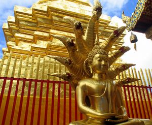 Among the notable nagas of Buddhist tradition is Mucalinda, nagaraja and protector of the Buddha. In the Vinaya Sutra (I, 3), shortly after his enlightenment, the Buddha is meditating in a forest when a great storm arises, but graciously, King Mucalinda gives shelter to the Buddha from the storm by covering the Buddha's head with his seven snake heads.[27] Then the king takes the form of a young Brahmin and renders the Buddha homage.[27]