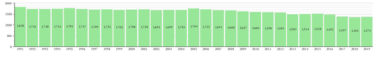 With 1,346 inhabitants اعتبارا من 2020[تحديث], Narsaq is the second-largest town in the Kujalleq municipality.[1] The population has decreased 25% relative to the 1990 levels, and has been decreasing over the last several years. Most towns and settlements in southern Greenland exhibit negative growth patterns over the last two decades, with many settlements rapidly depopulating.[12]