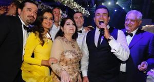 صورة تجمع بين نضال بستاني، وابنها سعد الحريري وبهاء الحريري في حفل زفاف الأخير في باريس، يوليو 2015. يظهر في الصورة المغني عمرو دياب.