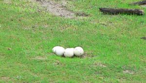 أنثى النعام تقف على مقربة من عش البيض ؛ لحراسته. ويضع مايقرب من ثلاث إلى خمس نعامات بيضهن ـ عادة ـ في عش واحد.