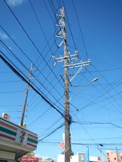 خط نقل 115 كيلو فولت في الفلبين، إلى جانب خطوط التوزيع 20 كيلو فولت و إنارة الشوارع، كلها مثبتة في الخشب قطب الإرسال الفرعي