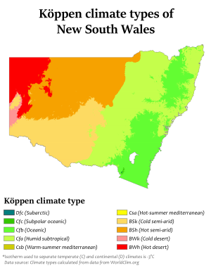The climate along the flat, coastal plain east of the range varies from oceanic in the south to humid subtropical in the northern half of the state, right above Wollongong. Rainfall is highest in this area; however, it still varies from around 800 ميليمتر (31 in) to as high as 3،000 ميليمتر (120 in) in the wettest areas, for example Dorrigo. In the state's south, on the westward side of the Great Dividing Range, rainfall is heaviest in winter due to cold fronts which move across southern Australia, while in the north, around Lismore, rain is heaviest in summer from tropical systems and occasionally even cyclones.[77] During late winter, the coastal plain is relatively dry due to foehn winds that originate from the Great Dividing Range;[78] the mountain range block the moist, westerly cold fronts that arrive from the Southern Ocean, whereby providing generally clear conditions on the leeward side.[79][80]