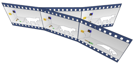 في الحالة المرسومة أعلاه، الجسيم في الموضع A بصورة مؤكدة 100 في المئة قبل إجراء القياس. في هذه الحالة (التي ليس فيها تراكب محيّر) تصف معادلة شرودينگر كيفية تطور الحالة الإجمالية إلى حالة إجمالية نهائية لا التباس فيها: التآثر بين الجسيم والجهاز يقدح المؤشر A. ثم ينتقل الضوء إلى الراصد الذي يراه ويسجل أن المؤشر A أومض (الأسفل).