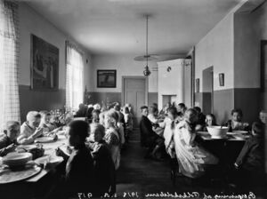 التلاميذ وهم يستمتعون بالوجبات المدرسية في مدرسة ڤاليلا فولك في ڤاليلا، هلنسكي، فنلندا (1913)