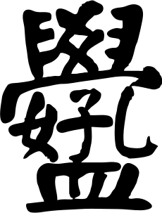 A Chinese chéngyǔ (expression) written as a ligature. It reads Kǒng Mèng hàoxué (孔孟好學) and means "to be as studious as Confucius and Mencius." All four characters contain as a component – left, top, right and bottom respectively – and share it at the center of the composition.