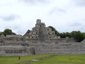 Much of Campeche's territory is filled with various archeological sites, almost all of which are Mayan. Maya sites in Campeche include Acanmul, Balamkú, Becán, Bolonchén, Calakmul, Chactún, Chicanná, Chunlimón, Edzná, Isla de Jaina, Lagunita, the Petén Basin, Río Bec, Isla Uaymil, Xculoc, Xpuhil, and Xtampak. These sites are less visited than sites to the east such as Chichen Itza, and Tulum.[9] An early important site is Edzna, located near the city of Campeche in a region known as los Chenes. It was one of the most important ceremonial centers in the pre-Classic Maya period (300-900 CE). Its building show Petén, Chenes and Puuc influence, with a large acropolis surrounded by various temples, the most important of which is the Pyramid of the Five Floors.[9][29] It was discovered in the 1920s and excavated in the 1940s. It is located away from other Mayan settlements on the peninsula and was probably a collection center for the agriculture products grown in the area, reaching its height between 600 and 900. These were sent to the city of Tikal in exchange for ritualistic adornment for the site. Its most important building is the Pyramid of the Five Stories, built as its name implies. Another important find came in the 1990s. During the planting season in early May, archeologist Antonio Benavides noticed that the setting sun illuminates a stucco mask hanging one of the pyramid's rooms. The effect also happens in August, during harvest and it is believed to be related to the asking and receiving of abundant crops.[9]