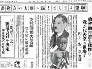 However, following the Manchurian Incident of 1931, the establishment of Manchukuo and the Lytton Report to the League of Nations condemning Japan's actions, Matsuoka was drawn back into the arena of foreign affairs to head Japan's delegation to the League of Nations in 1933. Matsuoka gained international notoriety for a speech condemning the League of Nations and announcing Japan's withdrawal, leading the Japanese delegation out of the League's assembly hall.[10][11]