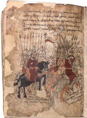 Pap likely struggled to rule a kingdom that was still recovering from the destruction wrought by Shapur II, leading him to make poor decisions that ultimately led to his downfall.[28] In addition to the controversy over the appointment of a new patriarch, Pap's relations with Valens further suffered due to the Roman commander Terentius, who wrote to the emperor criticizing Pap and advising him to get rid of the Armenian king in order to prevent him from defecting to Persia.[38] According to Faustus, Pap also demanded control over Caesarea and twelve other Roman cities including Edessa as former Arsacid domains while openly courting Persia, in defiance of the warnings of sparapet Mushegh and other nobles not to break the alliance with Rome.[39] Ammianus, on the contrary, claims that Pap was completely loyal to Rome.[38] Valens decided to execute Pap and invited him to a meeting in Tarsus. Pap arrived with 300 mounted escorts but quickly became anxious when he found out the emperor was not there in person, fleeing back toward Armenia and fighting off a legion that was sent after him.[40][41]