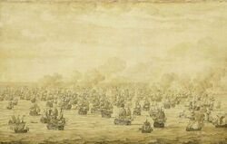 في عدد من المعارك البحرية، هولندا يكون لها اليد العليا في الحرب الأنگلو-هولندية الثالثة. اللوحة لـمعركة سخونڤلد الثانية بريشة ڤان دى ڤلدى. |