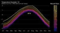 - Independent analyses by NASA and the National Oceanic and Atmospheric Administration (NOAA) show that 2016 was the hottest year on record, at 0.99 °C (1.78 °F) above the mid-20th century global mean average. This follows record warmth in the two preceding years 2015 and 2014.[26]