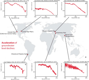 - A global analysis of groundwater levels reports rapid declines of over 0.5 meters per year are widespread and that declines have accelerated over the past four decades in 30% of the world's regional aquifers. The study also shows cases in which depletion trends have reversed following interventions such as policy changes.[62][63]