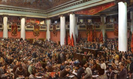 Following a meal in the Great Hall of Smolny, the delegates, accompanied by thousands of Petrograd workers, marched to the Uritsky Theater where they heard a keynote address on the international situation and the tasks of the Comintern delivered by Lenin.[12] Afterwards the delegates participated in a mass demonstration before gathering at the former stock exchange to see a costume drama called "Spectacle of the Two Worlds" performed by a cast of 3,000.[12]