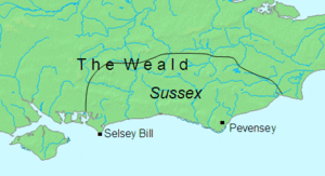 - حسب التأريخ الأنگلو-ساكسوني، Aelle، أول ملوك الساكسون الجنوبيين، يهبط على ساحل سسكس (إنگلترة)، مع أبنائه الثلاثة، بالقرب من Cymenshore. البريتون يشتبكون معه بمجرد هبوطه، ولكن قوته الفائقة تحاصرهم في پڤنسي وتدفعهم إلى the Weald. وعلى مدى السنوات التسع التالية، توسعت تدريجياً أملاك الساحلية الساكسوني، مؤسساً مملكة سسكس.