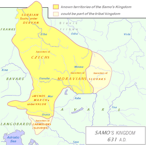 - سامو، المشهور بكونه تاجر من الفرنجة، يُنتخب ملك السلاڤ في موراڤيا، سلوڤاكيا and Lower Austria. A string of victories over the Avars proves his utilitas (usefulness) to his subjects, and he secures the throne ليؤسس مملكته، which stretches from the upper Elbe إلى الدانوب.[2]