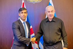 ومنذ تولي سوناك رئاسة الوزراء في يوليو 2023، يظهر سوناك دعمه لإسرائيل، على ما سماه "حق إسرائيل في الدفاع عن نفسها ضد المنظمات الإرهابية". وخلال حرب غزة على قطاع غزة منذ 2023، أكد سوناك تأييده لإسرائيل، كما ذهب إلى تل أبيب في زيارة تضامنية في 19 أكتوبر 2023. وكتب تغريدة على منصة إكس قال فيها "أنا في إسرائيل، أمة في حزن. إنني أحزن معكم، وأقف معكم ضد شر الإرهاب. اليوم ودائماً". وأتبعها بتغريدة ثانية يعبر فيها عن تعاطفه مع عائلات الأسرى الذين اعتقلتهم المقاومة الفلسطينية، وقال إنه سيعمل مع الشركاء "لإطلاق سراحهم من الإرهابيين"، وفق تعبيره.