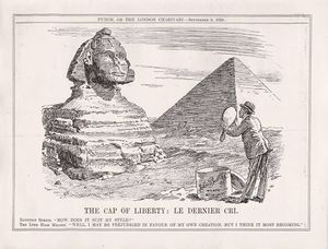 مجلة پنش في 8 سبتمبر 1920: عن محاولة ملنر إلباس مصر غطاء رأس بريطاني. فيجيب عليه أبو الهول بأنه يفضل زياً من صنع محلي.
