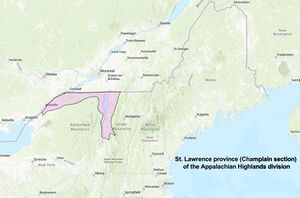 The province abuts the eastern edge of the St. Lawrence River in New York along the Canadian border and contains most of Lake Champlain in Vermont and New York. Most of the northern border of the St. Lawrence Valley province is adjacent to a physiographic division in Canada that is not part of the Appalachian Mountains in that country. Canada considers all land of the St. Lawrence Valley to be part of the Central Lowlands. The part of the St. Lawrence Valley province that abuts the Appalachian Uplands of Canada meets the Eastern Quebec Uplands. [23]