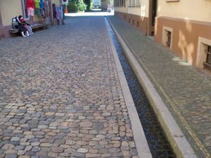 Artificial rills, known locally as Bächle, run along some old-town streets in the city of Freiburg, Germany.