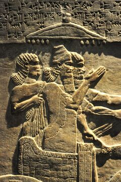 In contrast to the titles employed by the Babylonian kings in the south, which typically focused on the protective role and the piety of the king, Assyrian royal inscriptions tend to glorify the strength and power of the king.[14] Assyrian titularies usually also often emphasize the royal genaeology of the king, something Babylonian titularies do not, and also drive home the king's moral and physical qualities while downplaying his role in the judicial system.[15] Assyrian epithets about royal lineage vary in how far they stretch back, most often simply discussing lineage in terms of "son of ..." or "brother of ...". Some cases display lineage stretching back much further, Shamash-shum-ukin (ح. 667–648 BC) describes himself as a "descendant of Sargon II", his great-grandfather. More extremely, Esarhaddon (ح. 681–669 BC) calls himself a "descendant of the eternal seed of Bel-bani", a king who lived more than a thousand years before him.[16]