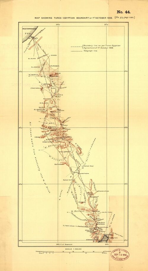 خريطة الحدود بين مصر والدولة العثمانية في أكتوبر 1906، في أعقاب التوقيع على اتفاقية 1906.