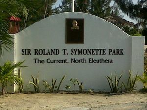 علامة مدخل منتزه السير رولاند سيمونت في مقاطعة شمال إلوثرا تخلد ذكرى السير رولاند تيودور سيمونت، أول رئيس وزراء للبهاماز.