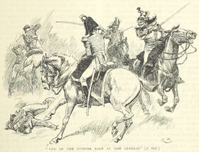 أبركرومبي (في الوسط) وهو يحارب اثنين من الفرسان الفرنسيين (من كتاب باللغة الإنگليزية)