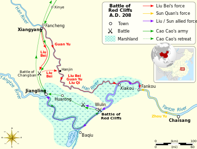 معركة المنحدرات الحمراء, otherwise known as the Battle of Chibi, was a decisive battle fought at the نهاية أسرة هان, about twelve years prior to the beginning of the Three Kingdoms period in Chinese history. It was fought in the winter of AD 208/9[2] between the allied forces of the southern warlords Liu Bei and Sun Quan and the numerically superior forces of the northern warlord Cao Cao. Liu Bei and Sun Quan successfully frustrated Cao Cao's effort to conquer the land south of the Yangtze River and reunite the territory of the Eastern Han dynasty. The allied victory at Red Cliffs ensured the survival of Liu Bei and Sun Quan, gave them control of the Yangtze (de Crespigny 1990:273), and provided a line of defence that was the basis for the later creation of the two southern states of Shu Han and Eastern Wu. The battle has been called the largest naval battle in history in terms of numbers involved.[3]