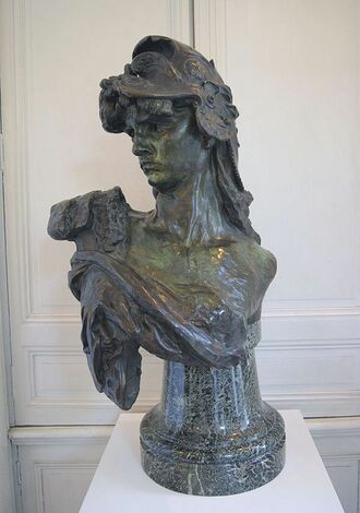 Auguste Rodin's sculpture of a head of Bellona (1879) originally was created for a monument to the French Third Republic and shows even more belligerence. Modelled on his mistress Rose Beuret while in a bad mood, the head is drawn back in proud anger, turning in dynamic movement to look along the line of her right shoulder.[32] Defence in war is the message of Georg Kolbe's Bellona fountain in Wuppertal. Originally commissioned in 1915, it depicted the helmeted goddess carrying a sword in her left hand and inspiring a kneeling young man. The statue was not erected until 1922, by which time it functioned as a war memorial.[33]