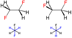Anti (left) and gauche (right) conformations of 1,2-difluoroethane. The second row shows the Newman projection.
