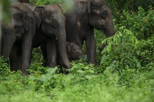 The moist climate and undisturbed nature of the rocky mountainsides appears to have allowed a rich variety of wildlife to thrive, although the Cardamom and Elephant Mountains are poorly researched and the wildlife that is assumed to be here remains to be catalogued. They are thought to be home to over 100 mammals such as the large Indian civet and banteng cattle, and most importantly the mountains are thought to shelter at least 62 globally threatened animal species and 17 globally threatened trees, many of them endemic to Cambodia.[23] Among the animals are fourteen endangered and threatened mammal species, including the largest population of Asian elephant in Cambodia and possibly the whole of Indochina although this still needs to be proved. Other mammals, many of which are threatened, include Indochinese tiger, clouded leopard (Pardofelis nebulosa), dhole (a wild dog) (Cuon alpinus), gaur (Bos gaurus), banteng (Bos javanicus), the disputed kting voar (Pseudonovibos spiralis), Malayan sun bear, pileated gibbon (Hylobates pileatus), Sumatran serow (Capricornis sumatraensis), Sunda pangolin and the Tenasserim white-bellied rat.[24] There are at least 34 species of amphibians, three of them described as new species to science from here.[25]