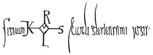 Monogram of Charlemagne, from the subscription of a royal diploma: "Signum (monogr.: KAROLVS) Caroli gloriosissimi regis"