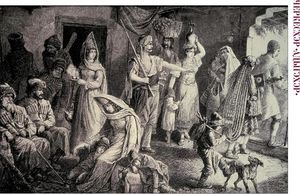 شركس مقيمون في منزل عائلة بلغارية مهجرة، رسم في عقد 1870.