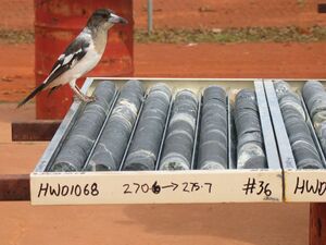 Rock core samples, the product of a diamond rig. A pied butcherbird perches nearby.