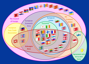 European Political CommunitySchengen AreaCouncil of EuropeEuropean UnionEuropean Economic AreaEurozoneEuropean Union Customs UnionEuropean Free Trade AssociationNordic CouncilVisegrád GroupBaltic AssemblyBeneluxGUAM Organization for Democracy and Economic DevelopmentCentral European Free Trade AgreementOrganization of the Black Sea Economic CooperationUnion StateCommon Travel AreaInternational status and usage of the euro#Sovereign statesSwitzerlandLiechtensteinIcelandNorwaySwedenDenmarkFinlandPolandCzech RepublicHungarySlovakiaBulgariaRomaniaGreeceEstoniaLatviaLithuaniaBelgiumNetherlandsLuxembourgItalyFranceSpainAustriaGermanyPortugalSloveniaMaltaCroatiaCyprusRepublic of IrelandUnited KingdomTurkeyMonacoAndorraSan MarinoVatican CityGeorgia (country)UkraineAzerbaijanMoldovaBosnia and HerzegovinaArmeniaMontenegroNorth MacedoniaAlbaniaSerbiaKosovoRussiaBelarusSupranational European Bodies.svg
