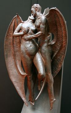 In Muslim culture, devils are believed to be hermaphrodite creatures created from hell-fire, with one male and one female thigh. By that, they procreate without another mate. It is generally believed that devils can harm the souls of humans through their whisperings. While whisperings tempt humans to sin, the devils might enter the hearth (qalb) of an individual. If the devils take over the soul of a person, this would render them aggressive or insane.[61] In extreme cases, the alterings of the soul are believed to have effect on the body, matching its spiritual qualities.[62]