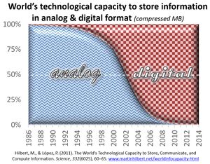 في أواخر الثمانينات، أقل من 1% من العالم خزنوا معلوماتهم بصيغة رقمية، بينما أصبحت النسبة 94% في 2007، وأكثر من 99% في عام 2014. [43]