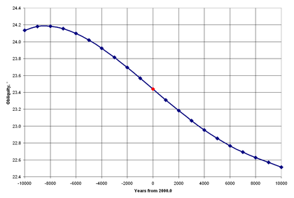 تقطع مسار الشمس (في وسط دائرة البروج) مستوى الاستواء السماوي بزاوية ميل تسمى ميل دائرة البروج وتقدر بحوالي 23°27' وهي متغيرة نتيجة تبادر الاعتدالين والترنح اللذان يحدثان تغييرا في وضعي كل من دائرة البروج ومستوى الاستواء بالنسبة للنجوم الثوابت.