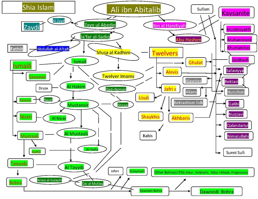 (Note: Kaysani's Imam Hanafiyyah is descendant of Ali from Ali's wife Khawlah, not Fatimah. Druze bifurcated after Imam Hakim are no more Shia.)