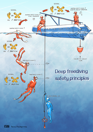 The safety team is usually made up of volunteers, or paid staff in some major events, and is supervised by the Chief of Safety. Each competitor is monitored by a team of breath-hold safety divers who will descend in time to meet the competitor during their ascent, and monitor them for the rest of the ascent. They will intervene if necessary, typically by securing the competitor's airway and swimming them up to the surface. The first safety diver will meet the competitor at somewhere around 1/3 to 1/4 of the target depth, usually with a maximum of 30m. The second will meet them about 10m shallower, and a third will be on standby in case of an emergency. The work can be challenging as many dives are done in a day, so the team of safety divers is usually rotated to ensure that they are not overtasked.[37]