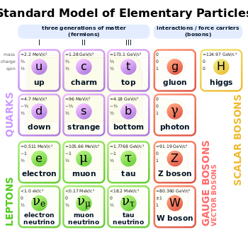 The Standard Model of elementary particles, with the fermions in the first three columns, the gauge bosons in the fourth column, and the Higgs boson in the fifth column
