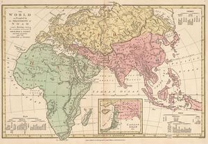1823 map by Robert Wilkinson (see also 1797 version here). Prior to the mid-19th century, Shem was associated with all of Asia, Ham with all of Africa and Japheth with all of Europe.
