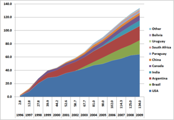 71. ^ أ ب Field areas 2009: Genetically modified plants: Global cultivation on 134 million hectares GMO Compass, March 29, 2010. Retrieved August 11, 2010.