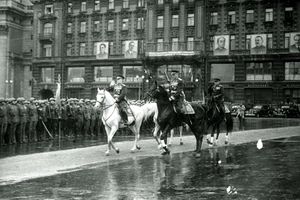 ژوكوڤ يمتطي جواداً رمادياً من فصيلة أخال-تكه أثناء استعراض النصر بموسكو، 1945. ويوجد الآن تمثال له على صهوة جواد بالقرب من هذا المكان.