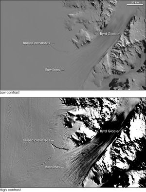 Low and high contrast images of the Byrd Glacier. The low-contrast version is similar to the level of detail the naked eye would see — smooth and almost featureless. The bottom image uses enhanced contrast to highlight flow lines on the ice sheet and bottom crevasses.
