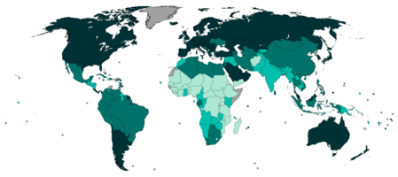 Generally, the Global North and the Global South correlate with the Western world and the Eastern world, respectively.[7] The two groups are often defined in terms of their differing levels of wealth, economic development, income inequality, and strength of democracy, as well as by their political freedom and economic freedom, as defined by a variety of freedom indices. Countries of the Global North tend to be wealthier, less unequal, more democratic, and capable of exporting technologically advanced manufactured products, among other characteristics. In contrast, countries of the Global South tend to be poorer, more unequal, less democratic, and heavily dependent on their largely agrarian-based economic primary sectors.[ث] Some scholars have suggested that the gap of inequality between the Global North and the Global South has been narrowing due to the effects of globalization.[8] Other scholars have disputed this position, suggesting that the Global South has instead become poorer vis-à-vis the Global North in this same timeframe.[9][10][11][12]