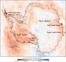 رسم ببياني يُظهر ارتفاع الحرارة في قارة أنتركتيكا بين عامي 1979 و2007، والذي وَصلَ في بعض المناطق إلى درجتين مئويتين.