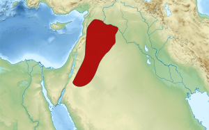 When Shalmaneser III descended on Pattin in 858 BC, he fought a force which included two Arab chieftains from transhumant tribes of the lower Orontes valley: a certain Bur-'Anat of Yašbuq, and Hada[d-ya]ṯa of a tribe whose name is lost.[15] In the Battle of Qarqar in 853 BC, Arabs were part of a Damascene coalition of Syrian and Israelite allies under Gindibu, who ruled over an Arab kingdom located in the northeastern parts of present-day Jordan and Wadi Sirhan. In the reign of Tiglath-Pileser III (744–727 BC), the "Arabāy" (Arabs) were among the Syrians integrated into the Assyrian administrative system, and were reportedly located in the regions of Damascus, Tadmor and Homs.[16][17] Tiglath-Pileser III even appointed a certain Arab, Idibi'ilu, to the Sinai peninsula jurisdiction.[15] Arab raiders were also active in the Beqaa Valley, where they attacked Sargon II's (722–705 BC) troops.[15][17]